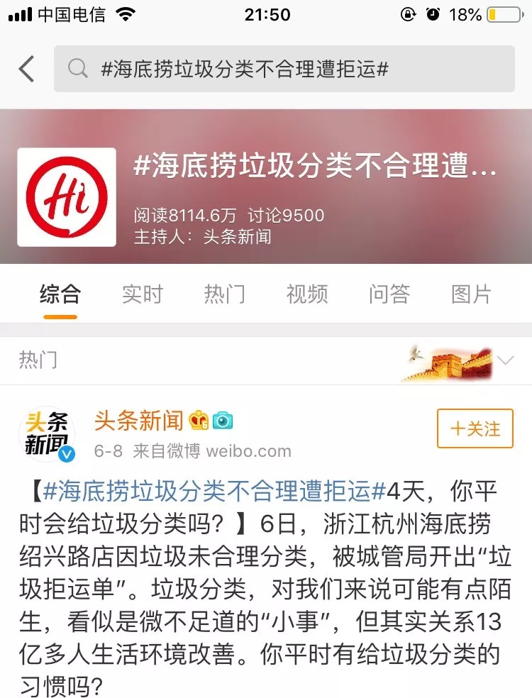 日前,海底撈杭州某門(mén)店由于垃圾處理不當(dāng),垃圾分類不合理而被相關(guān)部門(mén)開(kāi)出“垃圾拒運(yùn)單”,該事件經(jīng)媒體報(bào)道后引發(fā)熱議;