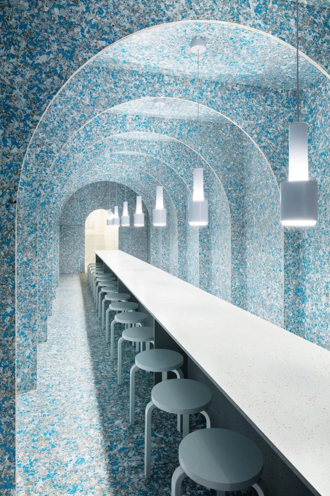 當(dāng)人們看到這個(gè)由藍(lán)色與銀色為主色調(diào),突顯出一種沉靜之美的餐廳時(shí),很難想象出它全部是回收材料打造而成的。
