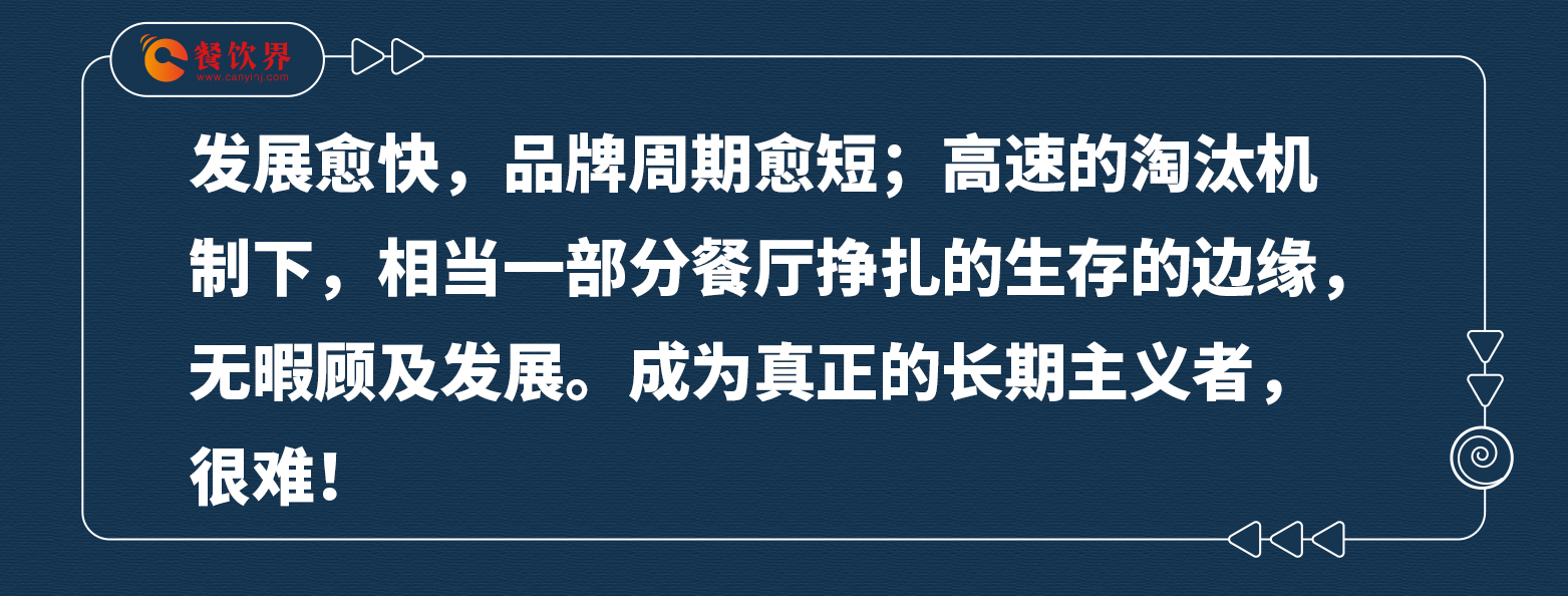 發(fā)展愈快,品牌周期愈短;高速的淘汰機制下,相當一部分餐廳掙扎的生存的邊緣,無暇顧及發(fā)展。成為真正的長期主義者,很難!