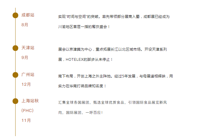 自2014年起,Hotelex揮師西南,突破區(qū)域限制,率先入蜀,至去年已是六番入蜀,展出面積達(dá)到45000平方米。去年剛結(jié)束的Hotelex廣州展也大受好評,3天時(shí)間,讓餐飲人在廣州演繹舌尖上的經(jīng)濟(jì)!今年增設(shè)天津站點(diǎn),津津有味,將亮相天津梅江會展中心。上海地區(qū),Hotelex上海秋季展將與兄弟展會FHC上海環(huán)球食品展同期舉行,將上演一場環(huán)球美食好戲!