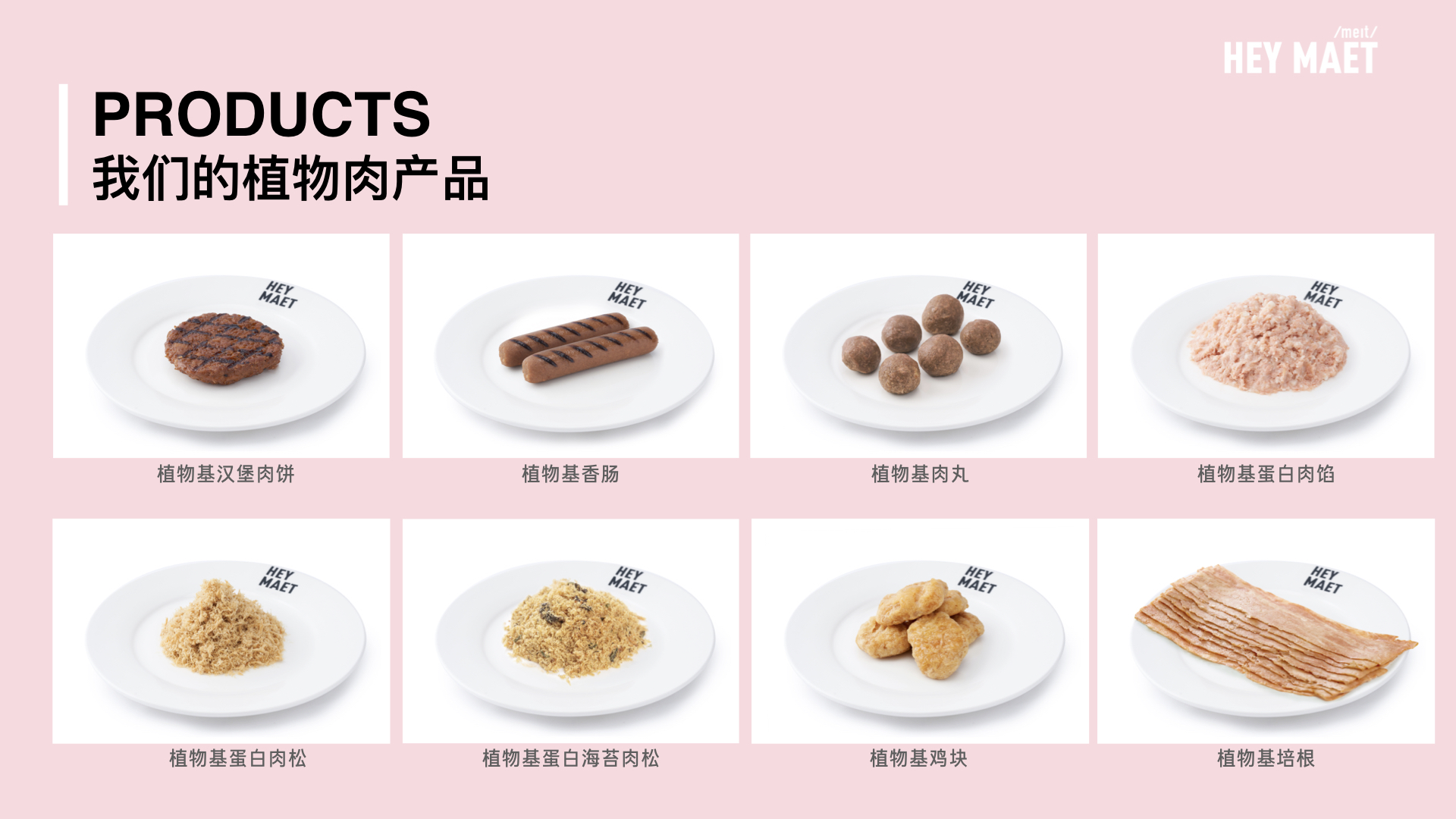 Hey Maet通過將豌豆、大豆、大米等植物蛋白深加工為組織蛋白和拉絲蛋白,輔以天然原料如甜菜汁、豌豆纖維、海藻多糖等原料,按照科學(xué)技術(shù)手段進(jìn)行合理比例調(diào)制,再加上多種礦物質(zhì)、維生素和多不飽和脂肪酸作為營養(yǎng)強(qiáng)化,最后經(jīng)過高速破壁、真空攪拌、低溫塑型等先進(jìn)食品加工工藝,制作出可以媲美真肉的植物肉產(chǎn)品。