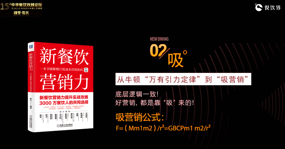我在我的新書《新餐飲營銷力》里首次提出了“吸營銷”理論。這里邊的“吸”,跟牛頓萬有引力定律里描述的”任何物體之間都有互相吸引力”原理幾乎相通。我們設(shè)想一下:牛頓萬有引力公司是F=GM1M2/r2,這里的M1M2分別是兩個物體的質(zhì)量,r是兩個物體之間的距離,質(zhì)量越大、距離越短,兩個物體之間的吸引力就越強。而在商業(yè)環(huán)境中,M1代表營銷主題的“產(chǎn)品力”,M2應(yīng)當(dāng)是目標(biāo)用戶對產(chǎn)品的“需求力”,r應(yīng)當(dāng)是營銷信息與目標(biāo)用戶之間的傳播路徑。