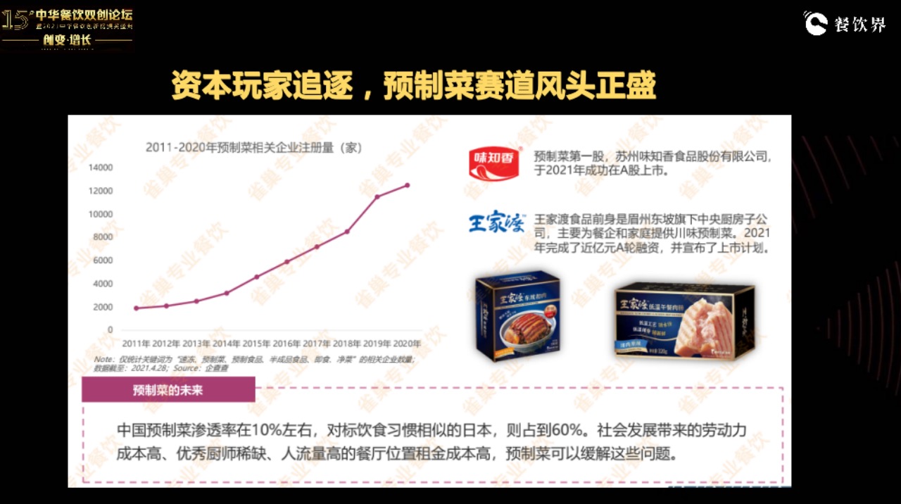 我們通過企查查數(shù)據(jù)統(tǒng)計,2011-2020年,預(yù)制菜相關(guān)企業(yè)注冊數(shù)量,從2000家增加到12000多家。在2021年,我們看到中國預(yù)制菜第一股味知香在國內(nèi)A股上市,估值超100億。