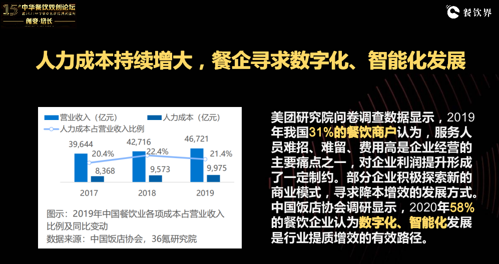 我們在開篇的一組驚人數(shù)據(jù)中,我們已經(jīng)得知,中國餐飲行業(yè)4大成本結(jié)構(gòu)每年都在遞增。對此,美團研究院問卷調(diào)查數(shù)據(jù)顯示,我國31%的餐飲商戶認為,服務(wù)人員難招、難留、費用高是企業(yè)經(jīng)營的主要痛點之一。而中國飯店協(xié)會調(diào)研顯示,202058%的餐飲企業(yè)認為數(shù)字化、智能化發(fā)展是行業(yè)增效的有效路徑。