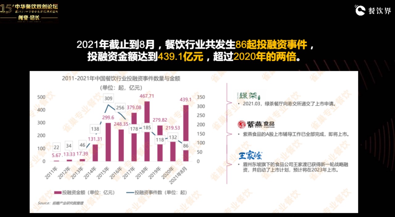在大消費賽道備受資本青睞的大背景下,餐飲也成為了“香餑餑”。據(jù)前瞻數(shù)據(jù)統(tǒng)計,2021年截止到8月,餐飲行業(yè)共發(fā)生86起投融資事件,投融資金額達到439.1億元,超過2020年的兩倍。
