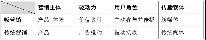傳統(tǒng)營銷多基于產(chǎn)品自身,往往表現(xiàn)為利益驅(qū)動(dòng),而吸營銷則多基于用戶和體驗(yàn),往往表現(xiàn)為價(jià)值驅(qū)動(dòng)。