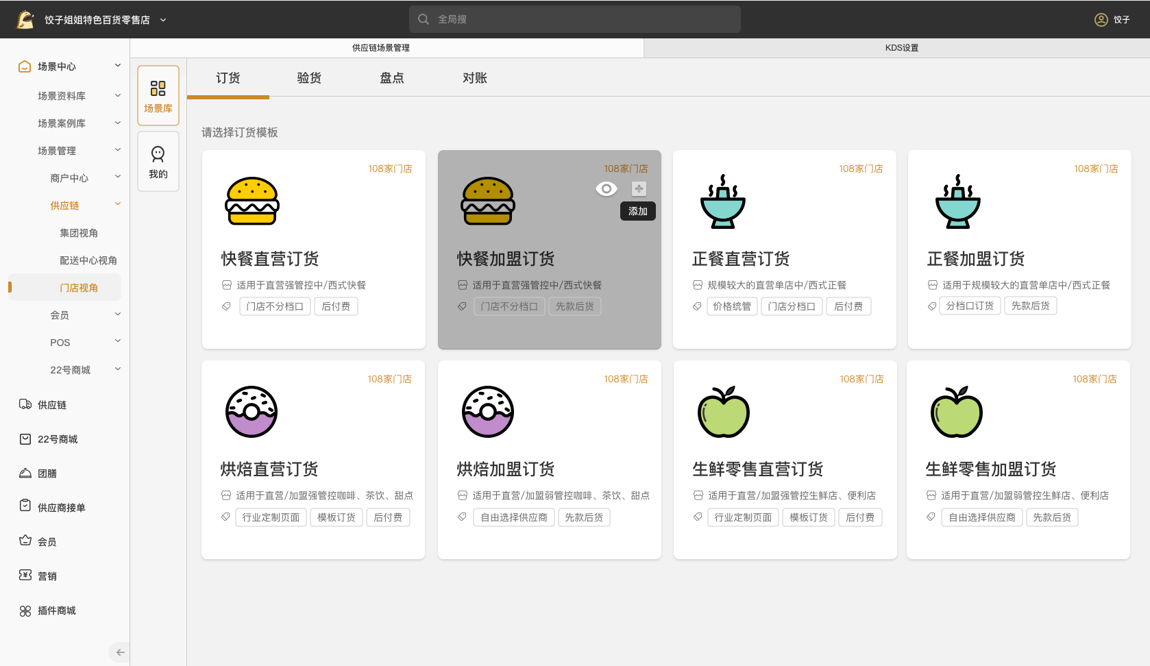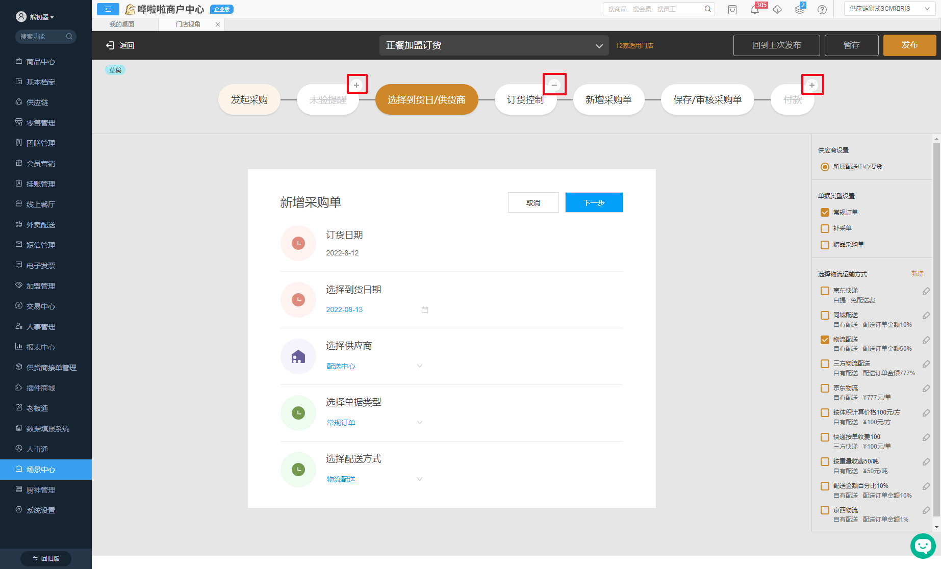基于服務(wù)頭部連鎖餐企方案的沉淀,暢捷版SCM針對不同業(yè)態(tài)下的訂貨、驗收、盤點等業(yè)務(wù)場景,推出了相應(yīng)的業(yè)務(wù)模板,總部可根據(jù)自身業(yè)務(wù)情況對業(yè)務(wù)模板進行參數(shù)預(yù)設(shè),統(tǒng)一下發(fā)給門店,門店無需在進行繁瑣的參數(shù)配置,直接調(diào)用即可。