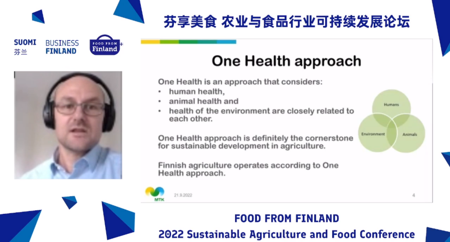 芬蘭中央農(nóng)林主聯(lián)合會(huì)國(guó)際貿(mào)易總監(jiān)Thimjos Ninios先生聚焦于上游生態(tài)介紹:“減少碳排放、增加碳固定、增加可再生能源的使用以及適應(yīng)氣候變化。為此,芬蘭農(nóng)業(yè)按照‘同一個(gè)健康’方法運(yùn)作。此方法考慮到了人類健康、動(dòng)物健康和環(huán)境健康。毫無(wú)疑問,‘同一個(gè)健康’方法是農(nóng)業(yè)可持續(xù)發(fā)展的基石?!?/span>