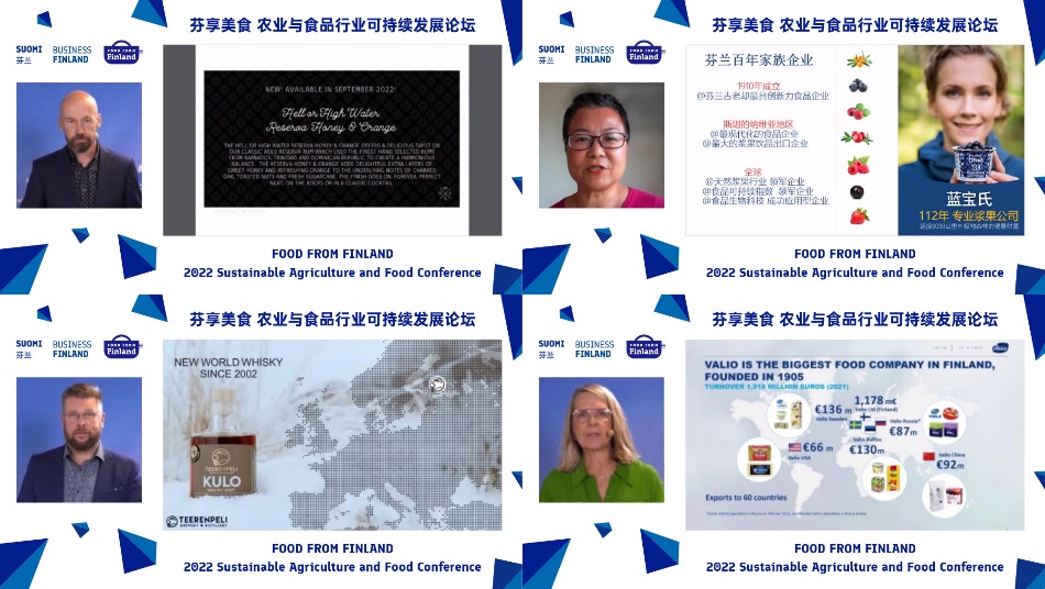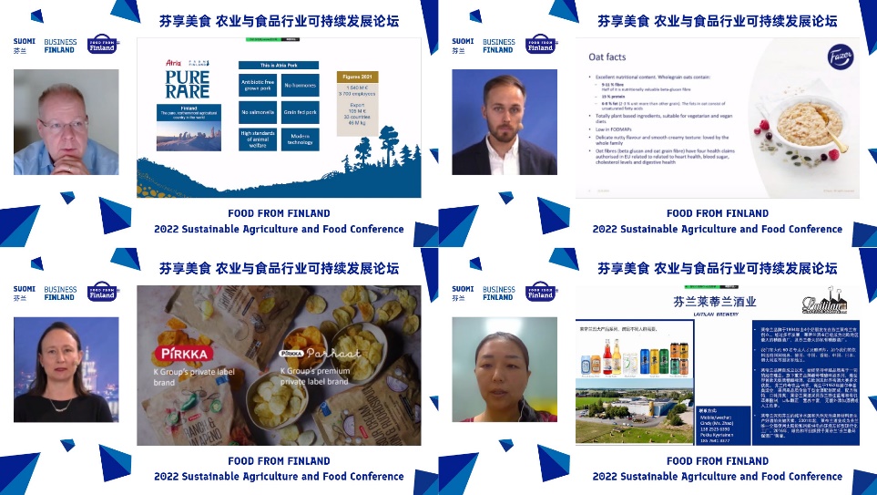 本次研討會(huì),邀請(qǐng)了Atria阿特睿、HKscan、Kesko凱斯科自有品牌Pirkka及與Kesko凱斯科跨境電商店鋪合作的品牌x 4 Olvi, Halva, Bonne JuomatLeipomo RostenFazer Mills菲澤、Valio蔚優(yōu)、Teerenpeli、One Eyed SpiritsLaitilan Wirvoitusjuomatehdas萊帝蘭、Roberts藍(lán)寶氏共13家龍頭企業(yè)參加。來(lái)自這些龍頭企業(yè)的相關(guān)負(fù)責(zé)人在線上各抒己見,通過(guò)爐邊會(huì)議、路演分享等形式,共同探討食品行業(yè)的可持續(xù)發(fā)展之道。這里整理摘錄出了爐邊會(huì)議和路演分享的精華部分,以供大家共同參考學(xué)習(xí)。