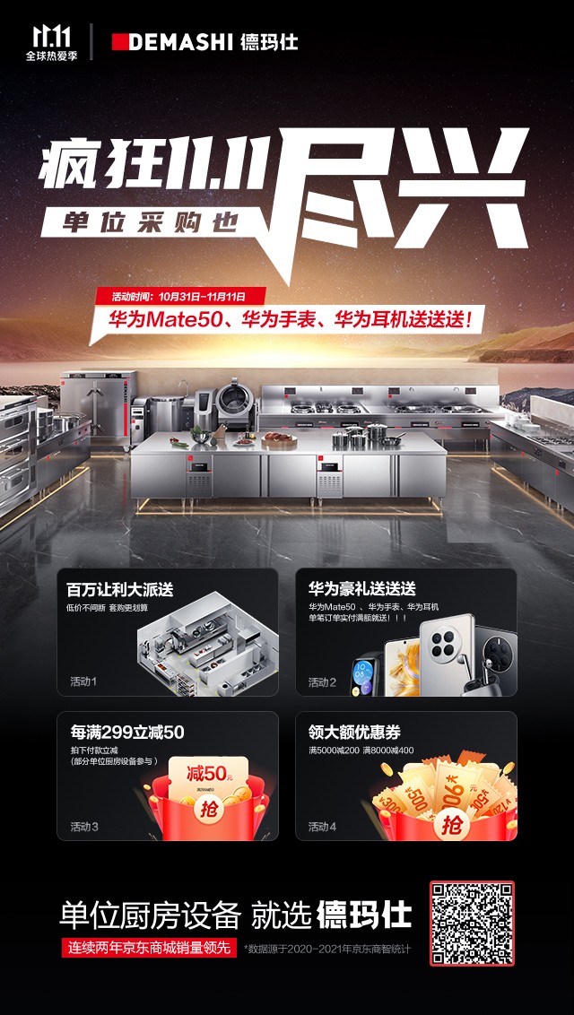 據(jù)了解,上京東,搜德瑪仕,雙11活動多重優(yōu)惠持續(xù)進行中,10月31日-11月11日期間,單位廚房整套采購更加劃算!除此之外,單筆訂單實付滿額就送華為產(chǎn)品,還有部分產(chǎn)品也將參加京東官方活動,每滿299立減50,以及大額的優(yōu)惠券可領(lǐng)取的活動。年底單位廚房一站煥新,在德瑪仕就能輕松實現(xiàn)。