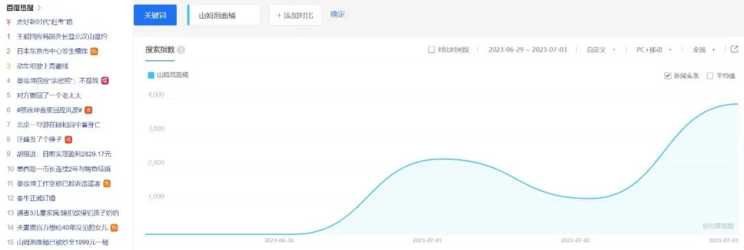 就在近日,山姆泡面桶空降各大熱搜榜。短短三天,山姆泡面桶的百度搜索指數(shù)從0狂飆到近4000,并順利登上百度搜索熱搜榜。在登上抖音熱搜后,相關(guān)#山姆泡面桶 的話題最高獲得超百萬次的播放量。