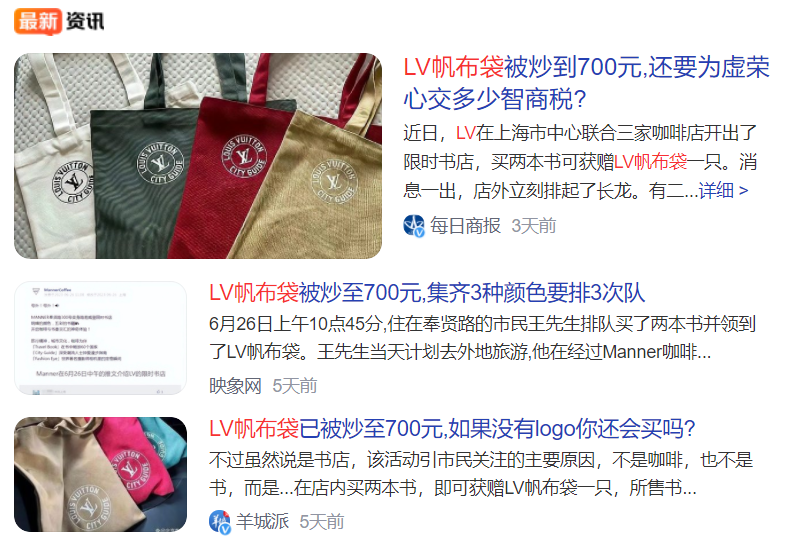 這不禁讓人聯(lián)想起近日的“580元LV帆布袋”。事實上,這并非是LV的“銷售”行為,而是一場“贈送”活動。按照活動設(shè)計,LV在上海聯(lián)合三家咖啡店,打造了“路易威登限時書店”,消費者在店內(nèi)購買至少兩本書,便可得到一只印有LV商標的帆布袋,而書的最低售價為290元一本。所以,理論上來說,消費者要想拿到這個帆布袋,至少需要花費580元,而且書店類似于快閃形式,“限時”。