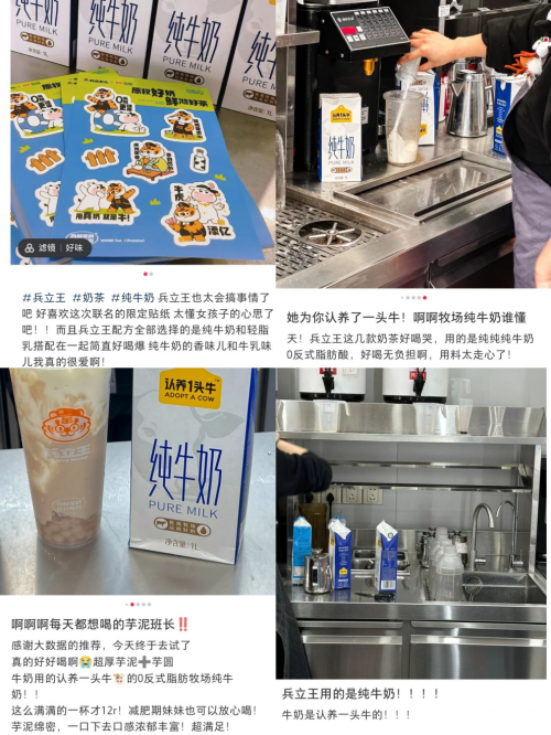 兵立王于2023年2月和認(rèn)養(yǎng)一頭牛達(dá)成了戰(zhàn)略合作,目前全國所有門店已開始使用,用來制作奶蓋、牛乳茶等產(chǎn)品。“認(rèn)養(yǎng)一頭?!弊鳛轲B(yǎng)牛大戶,是這幾年崛起的新銳乳制品品牌,致力于打造五好奶牛,優(yōu)選純種荷斯坦奶牛,擁有7座現(xiàn)代化牧場(chǎng),6大牧場(chǎng)均通過GAP一級(jí)認(rèn)證,實(shí)現(xiàn)奶牛自動(dòng)按摩,自動(dòng)擠奶等全自動(dòng)化管理;同時(shí)在各大電商平臺(tái)上銷量領(lǐng)先,憑借著獨(dú)特的品牌名,和“奶牛養(yǎng)得好,牛奶才會(huì)好”的產(chǎn)品品質(zhì),在消費(fèi)者中人氣頗高。