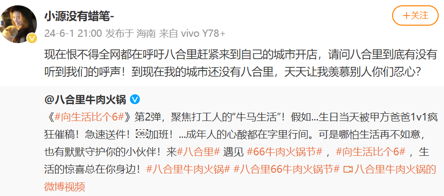 有網(wǎng)友發(fā)帖“全網(wǎng)呼吁八合里趕緊來到自己的城市開店”。