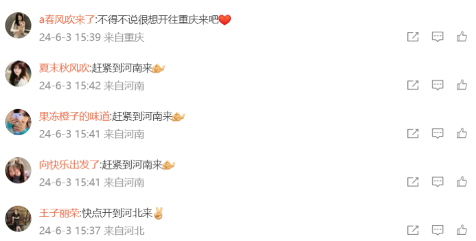 有網(wǎng)友在評(píng)論區(qū)“蓋樓”,“趕緊到河南來”“趕緊開到重慶”“快點(diǎn)開到河北”……