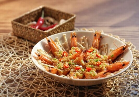 5. 碟內(nèi)先鋪金針菇,再擺放好開背蝦。把燒好的調(diào)味料澆蓋在蝦的開背處,湯汁淋在金針菇上。