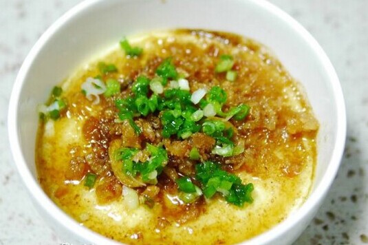 6. 炒好的蝦米末倒入蒸好的雞蛋羹中,撒上蔥花即可。