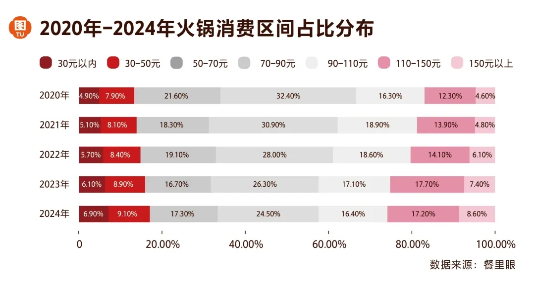 如下圖所示,火鍋消費(fèi)價(jià)格區(qū)間呈現(xiàn)兩極增長(zhǎng)、中間收縮的勢(shì)態(tài)。由2020年到2024年的數(shù)據(jù)變化來(lái)看,50元以下價(jià)格帶占比增長(zhǎng)了2.4%,110元以上價(jià)格帶占比增長(zhǎng)了8.9%。