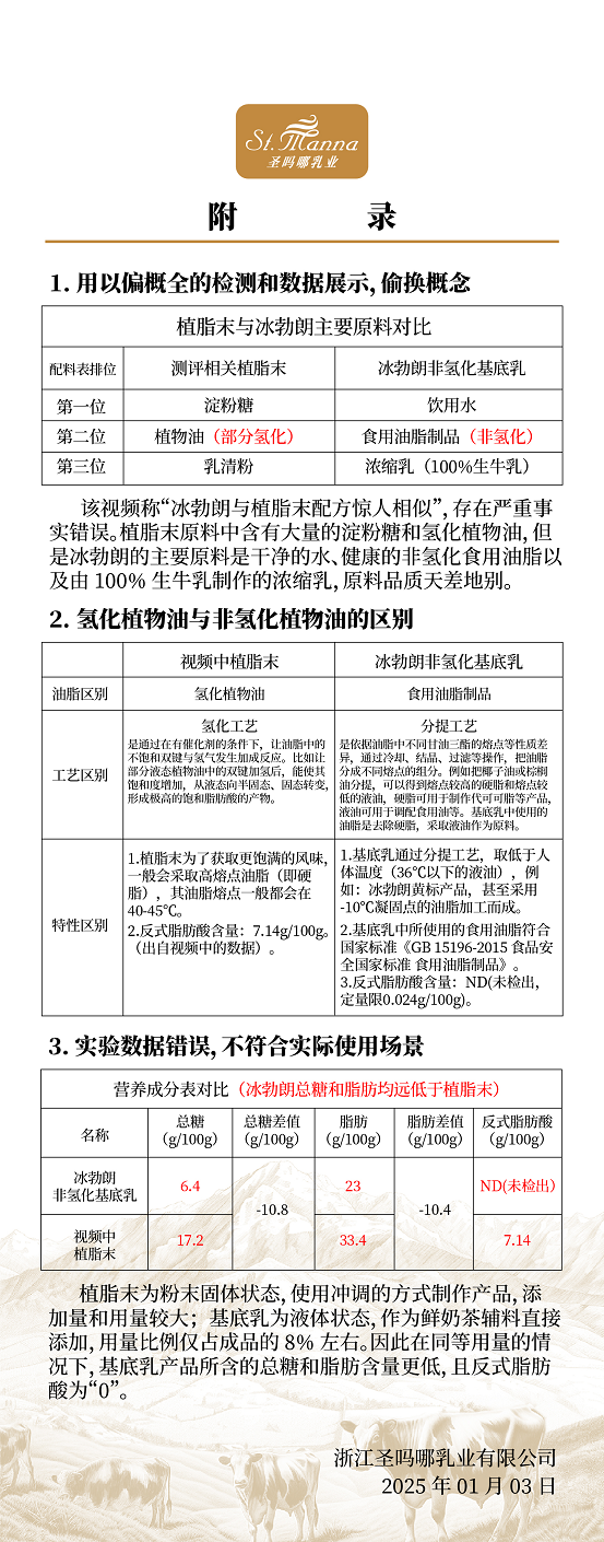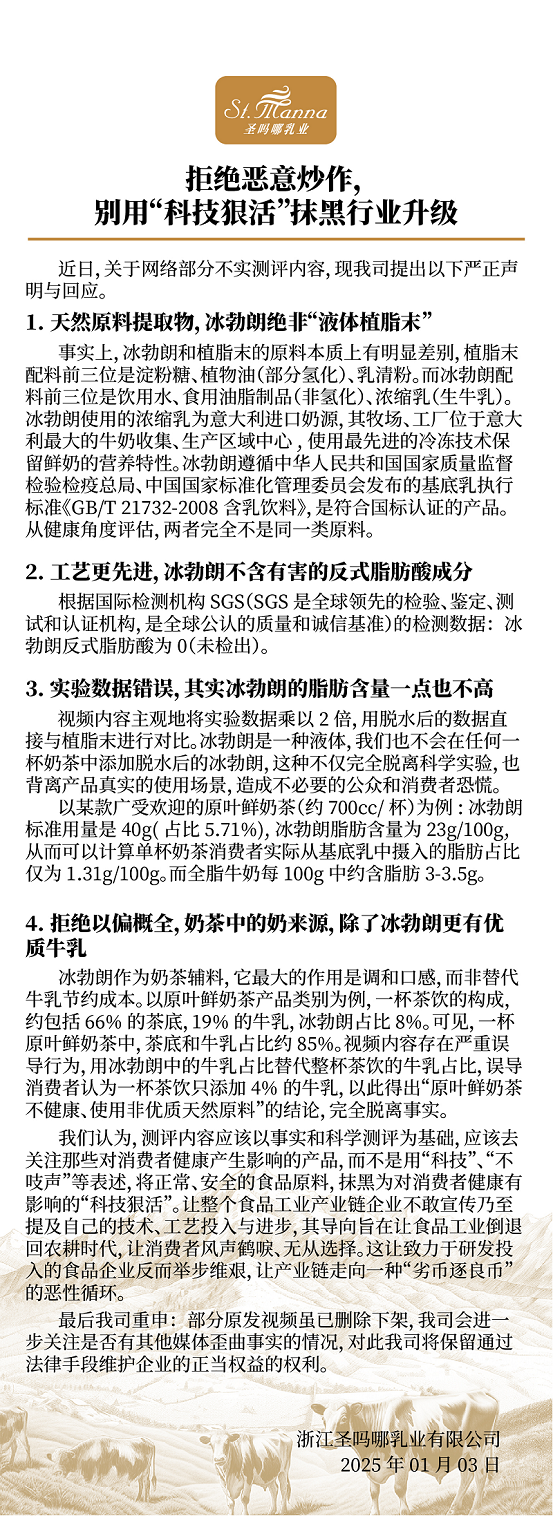 圣嗎哪回應(yīng),根據(jù)國(guó)際檢測(cè)機(jī)構(gòu)SGS的數(shù)據(jù),就原料本質(zhì)與健康影響而言,冰勃朗與植脂末是兩種完全不同的食品原料,評(píng)測(cè)視頻以偏概全,采用錯(cuò)誤的實(shí)驗(yàn)數(shù)據(jù),而非實(shí)際使用場(chǎng)景來(lái)對(duì)飲品的工藝定性,存在對(duì)消費(fèi)者的巨大誤導(dǎo)。