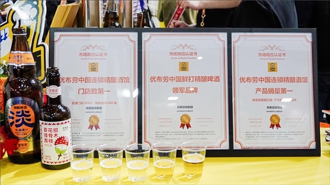 2024年7月,優(yōu)布勞榮獲得了尚普咨詢集團頒發(fā)的“中國鮮打精釀啤酒領(lǐng)軍品牌”、“中國連鎖精釀酒館產(chǎn)品銷量第一”,以及“中國連鎖精釀酒館門店數(shù)第一”三項稱號。