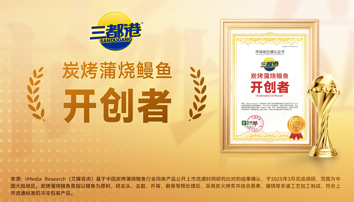2025年3月,三都港獲全球新經(jīng)濟(jì)產(chǎn)業(yè)第三方數(shù)據(jù)挖掘和分析機(jī)構(gòu)iiMedia Research(艾媒咨詢)授予的“炭烤蒲燒鰻魚開創(chuàng)者”市場地位確認(rèn)。