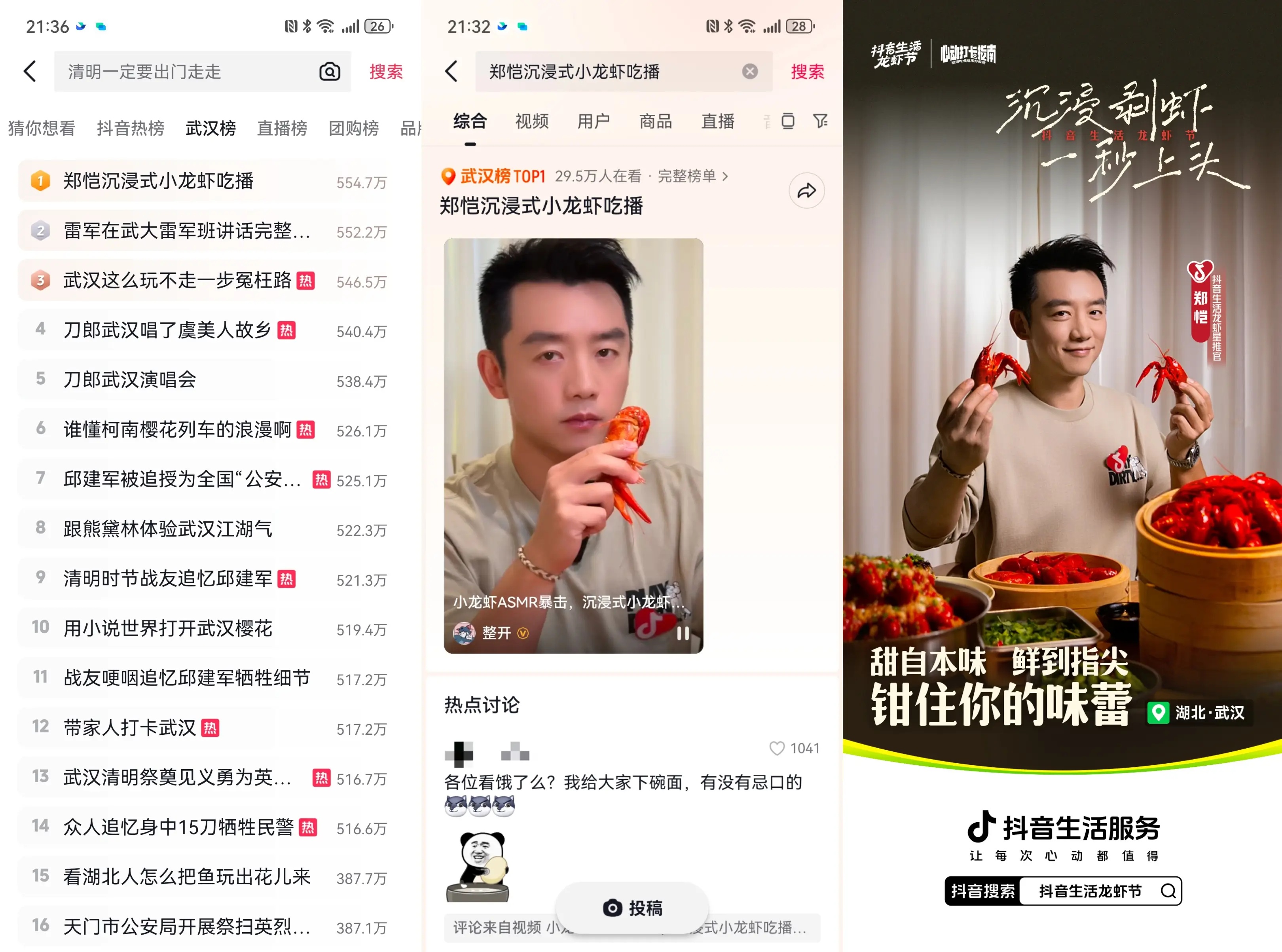 來武漢錄綜藝期間,鄭凱也不忘去撮一頓小龍蝦。在抖音,鄭愷則分享了他的“沉浸試吃蝦vlog”,以ASMR的形式,讓網(wǎng)友“聽見美味”。視頻一經(jīng)發(fā)出,相關(guān)話題#鄭愷沉浸式小龍蝦吃播 沖上全國熱榜TOP2,播放量超480萬次。武漢文旅等賬號接續(xù)視頻二創(chuàng),掀起一股打卡吃蝦熱。