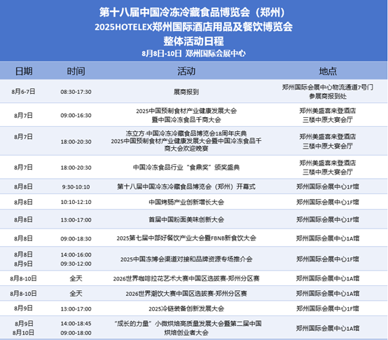2025年88日至10日,2025HOTELEX鄭州國(guó)際酒店用品及餐飲博覽會(huì)和第十八屆中國(guó)冷凍冷藏食品博覽會(huì)(鄭州)將在鄭州國(guó)際會(huì)展中心盛大開幕。
