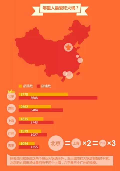 2015年底,方橙科技公布《數(shù)據(jù)庫里的火鍋業(yè)》。該報告選取北京、上海、廣州、深圳、南京5座一二線城市作為數(shù)據(jù)分析對象,從區(qū)域上涵蓋了華北、華南、華東3個部分,意在為用戶反饋出火鍋業(yè)在中國整體的發(fā)展現(xiàn)狀。