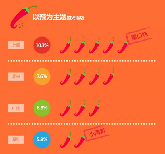 火鍋大數(shù)據(jù)顯示,在以辣為主題的火鍋店中,上海再次脫穎而出,以超過10%的高比例,成為了5大城市中名副其實的重口味。而深圳則以5.9%的比例在這次評比中墊底,成為了無可厚非的“小清新”。