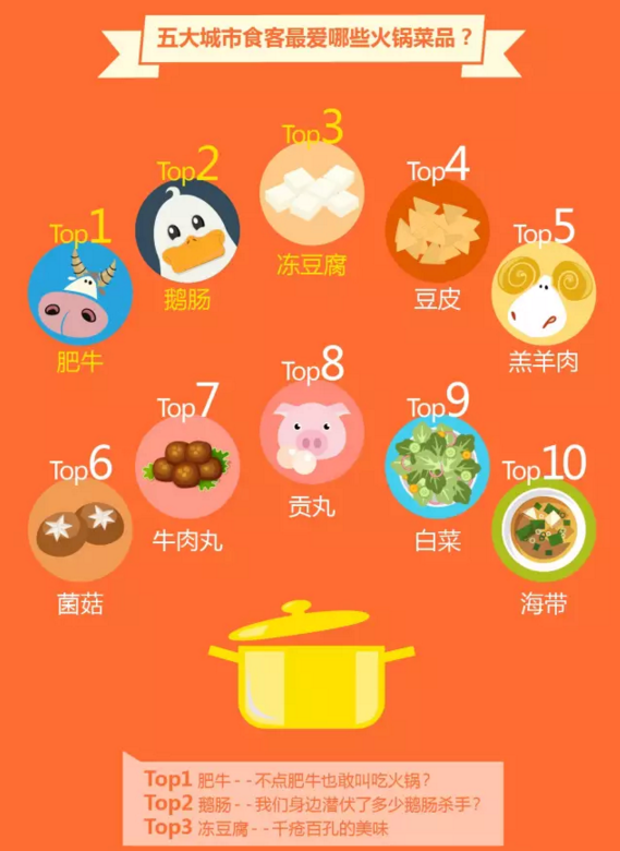 在火鍋明星菜品的評比中,肥牛、鵝腸和凍豆腐占據(jù)了排行榜的前三名,而豆皮、羔羊肉、菌菇、牛肉丸、貢丸、白菜、海帶則分列4到10位。