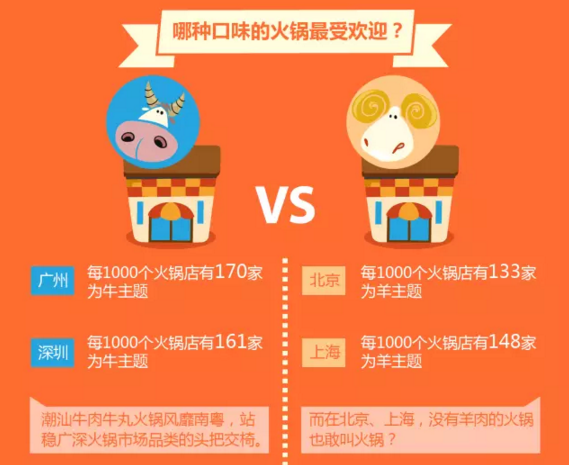 而按涮料的商品學分類,有羊肉、肥牛、魚、雞、菌類火鍋等等。根據(jù)大數(shù)據(jù)顯示,以牛羊主題的火鍋在5大城市的火鍋市場中引領風騷,占據(jù)了主流位置。