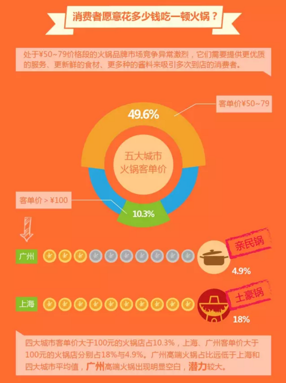 而在超過100元的客單價區(qū)段,5座一線城市只有10%的火鍋店,其中上海作為”土豪“的代表,在所有的2700余家火鍋店中,有18%的火鍋店客單價超過了100元客單價。而在餐飲市場普遍親民的廣州,只有4.9%的火鍋店客單價越過了100元的龍門,從另外一個角度來看,廣州的高端火鍋市場潛力巨大,有待挖掘。