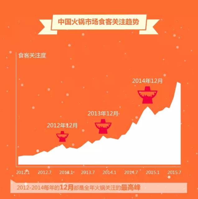在大眾的通識印象中,吃火鍋通常都代表著熱火朝天的氣氛。其實,火鍋的消費熱度也印證著這一常識,從2012年到2014年的消費熱度來看,每一年的寒冬12月,火鍋的消費熱度都會攀升至同年的尖鋒位置。