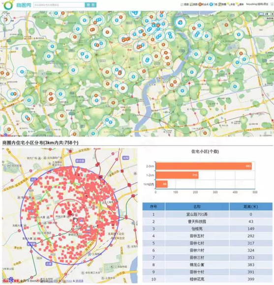 如下圖所示:直接在商圈秀智能平臺上輸入地址,便可得知競爭店鋪分布數(shù)量、消費者特征等有助選址的關鍵信息。