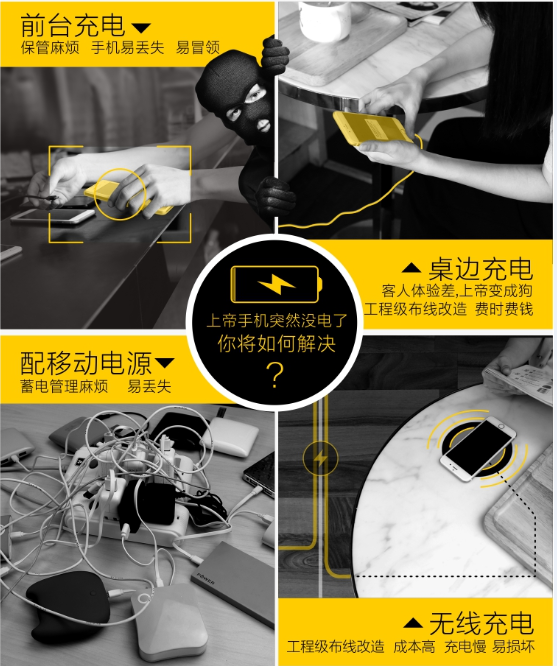 餐廳為滿足消費者的充電需求,在前臺設(shè)置排插、插座等,讓消費者自行充電。但是前臺充電,一來影響美觀,插線遍布不僅凌亂還有安全隱患;二來顧客必須離開自己的手機到座位上用餐,這便極大地降低了顧客的用餐情緒和體驗。再者,餐廳代為保管顧客手機,萬一出現(xiàn)丟失的情況,更影響餐廳聲譽。