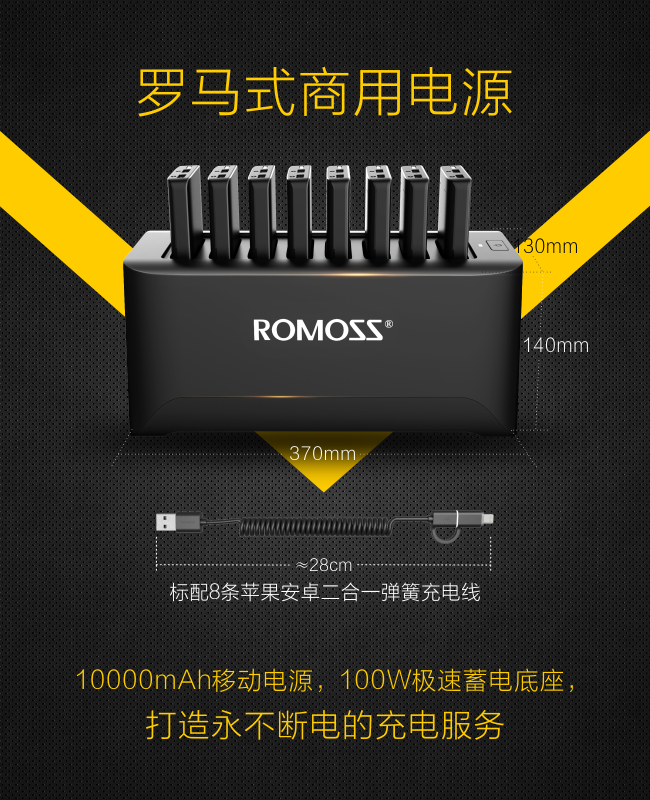 針對以上行業(yè)痛點,近日羅馬仕創(chuàng)新研發(fā)出的一款商用移動電源,通過“1個充電底座+8高品質(zhì)商用專屬移動電源+8條二合一彈簧充電線”產(chǎn)品創(chuàng)新模式,充分滿足餐廳顧客的消費需求,當(dāng)之無愧地成為了具備足夠“創(chuàng)新點”的產(chǎn)品。