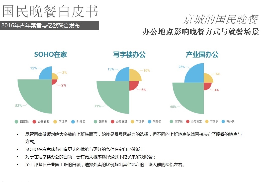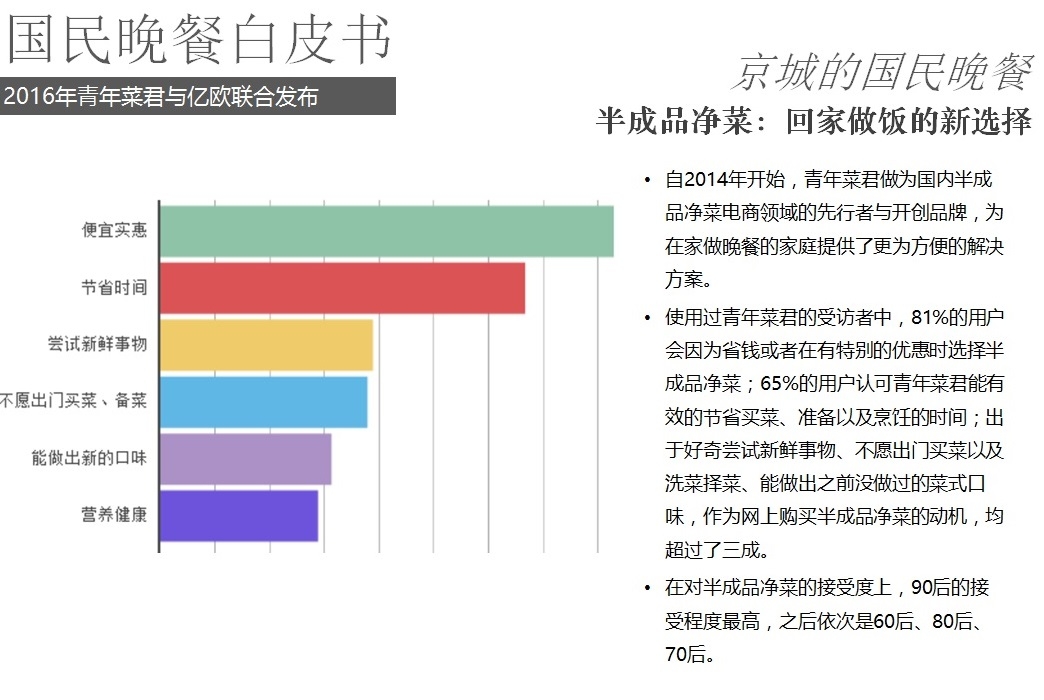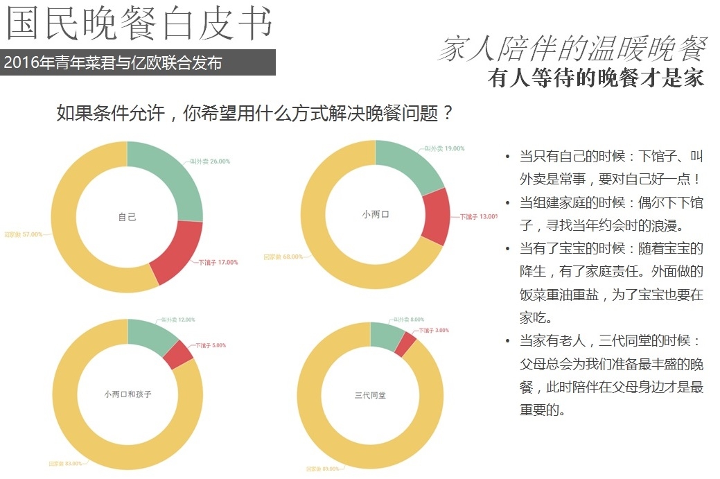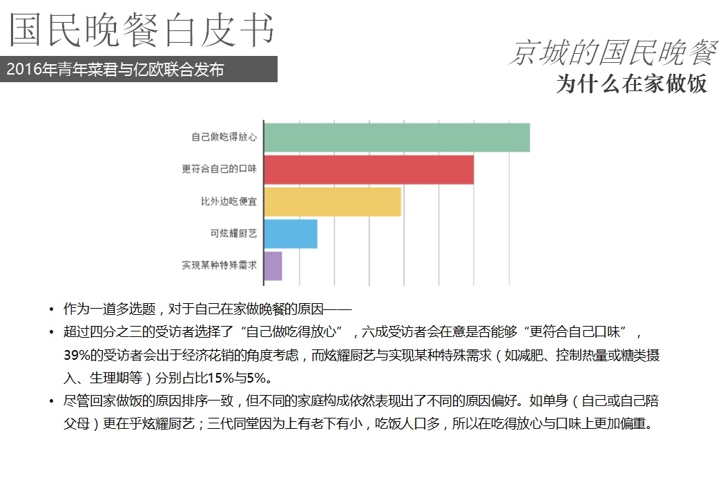 2016年5月18日,億歐聯(lián)合青年菜君發(fā)布北京國民晚餐數(shù)據(jù)白皮書,報(bào)告從晚餐種類、口味、價(jià)格、場所、訴求等角度進(jìn)行用戶分析,以5000份調(diào)查問卷數(shù)據(jù)為基礎(chǔ),反映國民的晚餐飲食習(xí)慣以及回家做飯和外賣的不同選擇。