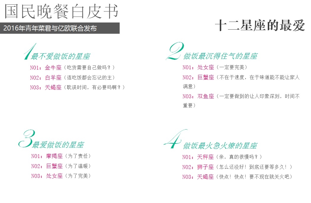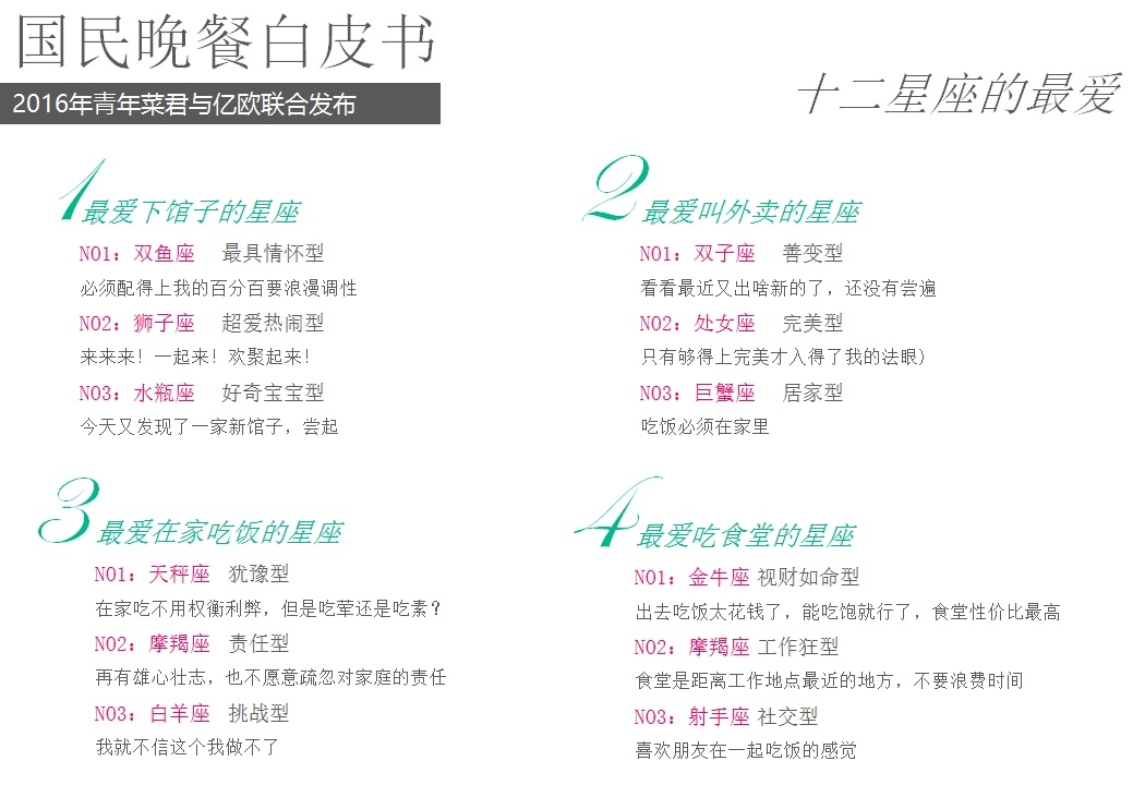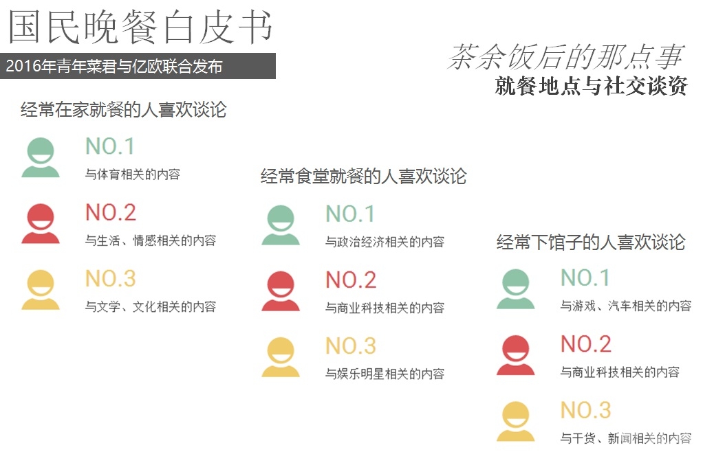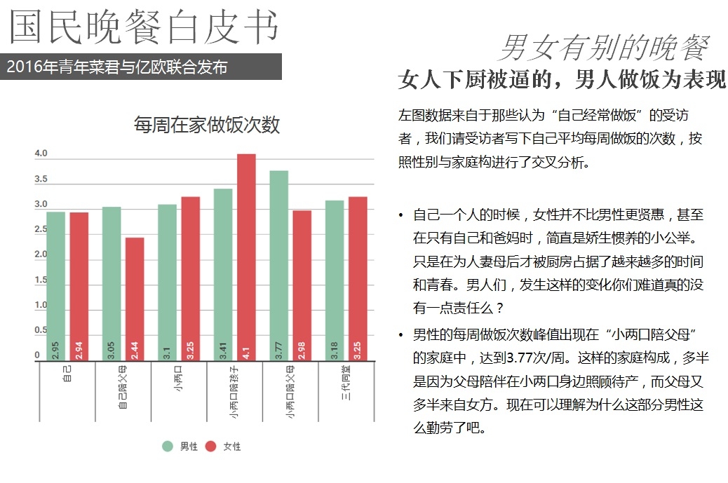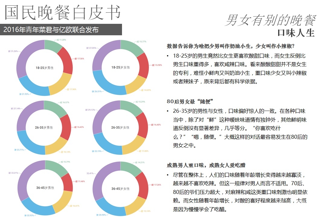 2016年5月18日,億歐聯(lián)合青年菜君發(fā)布北京國民晚餐數(shù)據(jù)白皮書,報(bào)告從晚餐種類、口味、價(jià)格、場所、訴求等角度進(jìn)行用戶分析,以5000份調(diào)查問卷數(shù)據(jù)為基礎(chǔ),反映國民的晚餐飲食習(xí)慣以及回家做飯和外賣的不同選擇。