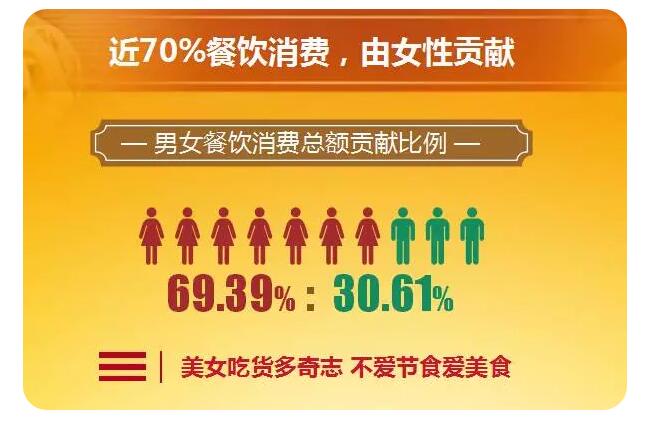 數(shù)據(jù)顯示,男女餐飲消費(fèi)比例為69.39%:30.61%,近70%的餐飲消費(fèi)由女性貢獻(xiàn)。