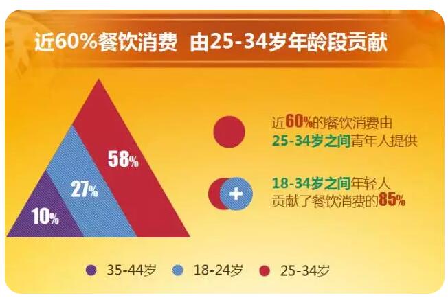 58%的餐飲消費(fèi)由25-34歲的青年消費(fèi)者貢獻(xiàn),85%的餐飲消費(fèi)由18-34歲的年輕消費(fèi)者貢獻(xiàn)。