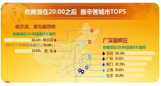 廣深最瘋狂:39.28%的深圳消費(fèi)者晚飯時(shí)間在20:00之后,37.67%的廣州消費(fèi)者晚飯時(shí)間在20:00之后。