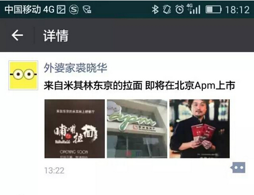 520這天中午,外婆家總裁裘曉華在微信朋友圈說:“來(lái)自米其林東京的拉面,即將在北京APM上市。”