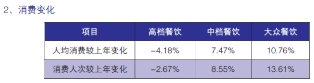 在我們分析的企業(yè)數據中,除快餐和團餐這兩個本身就是大眾化餐飲的業(yè)態(tài)外,其他三個業(yè)態(tài)-特色餐飲也就是正餐、火鍋和西餐及休閑餐飲的高檔消費在人次上均保持下降的態(tài)勢,而大眾餐飲在人均消費和消費人次上在所有業(yè)態(tài)中都增速明顯;