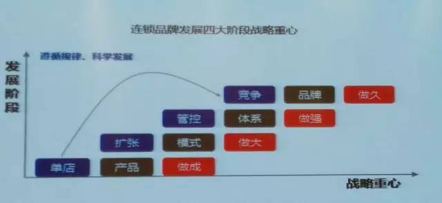 單店期,競爭核心是產品;擴張期,競爭核心是模式;管控期,競爭核心是體系;競爭期,競爭核心是品牌。
