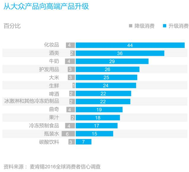 消費(fèi)升級(jí)正呈現(xiàn)出旺盛的勢(shì)頭和活力,高端產(chǎn)品的品類增速超過了大眾產(chǎn)品和價(jià)值型產(chǎn)品的品類。而消費(fèi)量—尤其是食品和飲料——?jiǎng)t增長乏力。