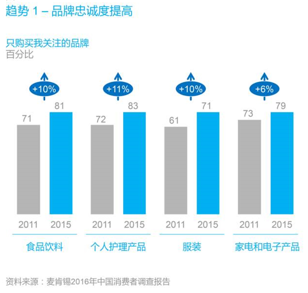 越來越多的中國消費(fèi)者開始只關(guān)注少數(shù)幾個(gè)品牌,其中一些人則進(jìn)一步鎖定某一個(gè)品牌。中國消費(fèi)者并不很愿意在自己關(guān)注的品牌之外購買其他品牌。例如在服飾品類,愿意選擇備選品牌之外的消費(fèi)者比例,已經(jīng)從2011年的約40%降至2015年的不足30%。