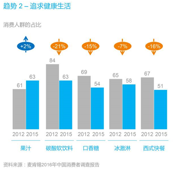 一個(gè)新的現(xiàn)象是,超過50%的消費(fèi)者偏愛健康和營養(yǎng)食品。其中,果汁普及率提升了2%,而非健康類食品的普及率有所下降:碳酸飲料下降了21%,口香糖下降了15%,西式快餐則下降了16%。