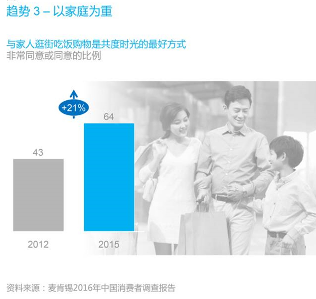 這一趨勢(shì)為消費(fèi)品行業(yè)帶來了深遠(yuǎn)的影響。盡管電子商務(wù)風(fēng)生水起,“購物休閑體驗(yàn)(retailtainment)”卻越來越吸引著人們。三分之二的消費(fèi)者表示,逛街吃飯購物是與家人共度時(shí)光的最好方式,與3年前相比上升了21%。