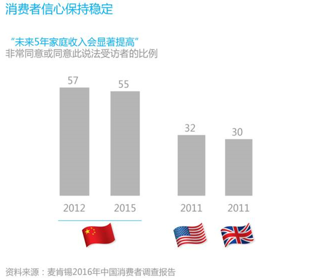 當(dāng)被問及未來收入預(yù)期時(shí),55%的受訪者相信未來五年中自己的收入將顯著增長,較2012年僅下降2個(gè)百分點(diǎn)。相比美國和英國,2011年持這一說法的消費(fèi)者分別為32%和30%。