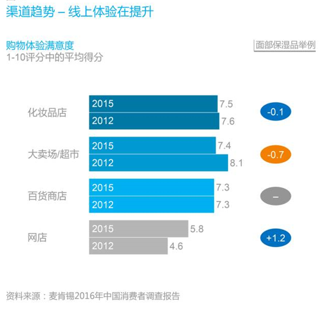 消費(fèi)者對(duì)實(shí)體店的滿意度仍然比在線渠道高,但隨著網(wǎng)購越來越受歡迎,線上和線下渠道的滿意度差距正在縮小。